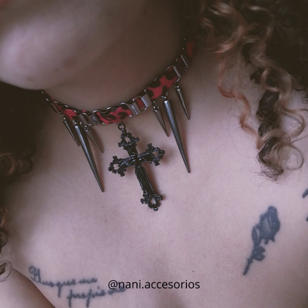 Cadena con cinta de cuerina animal print rojo y dijes de fundición