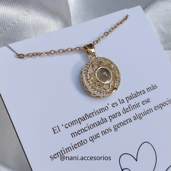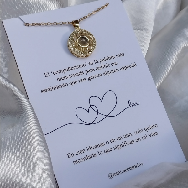 Collar de acero quirúrgico dorado 50cm, que contiene un dije con un visor que muestra una imagen con la frase "te amo" en 100 idiomas distintos.